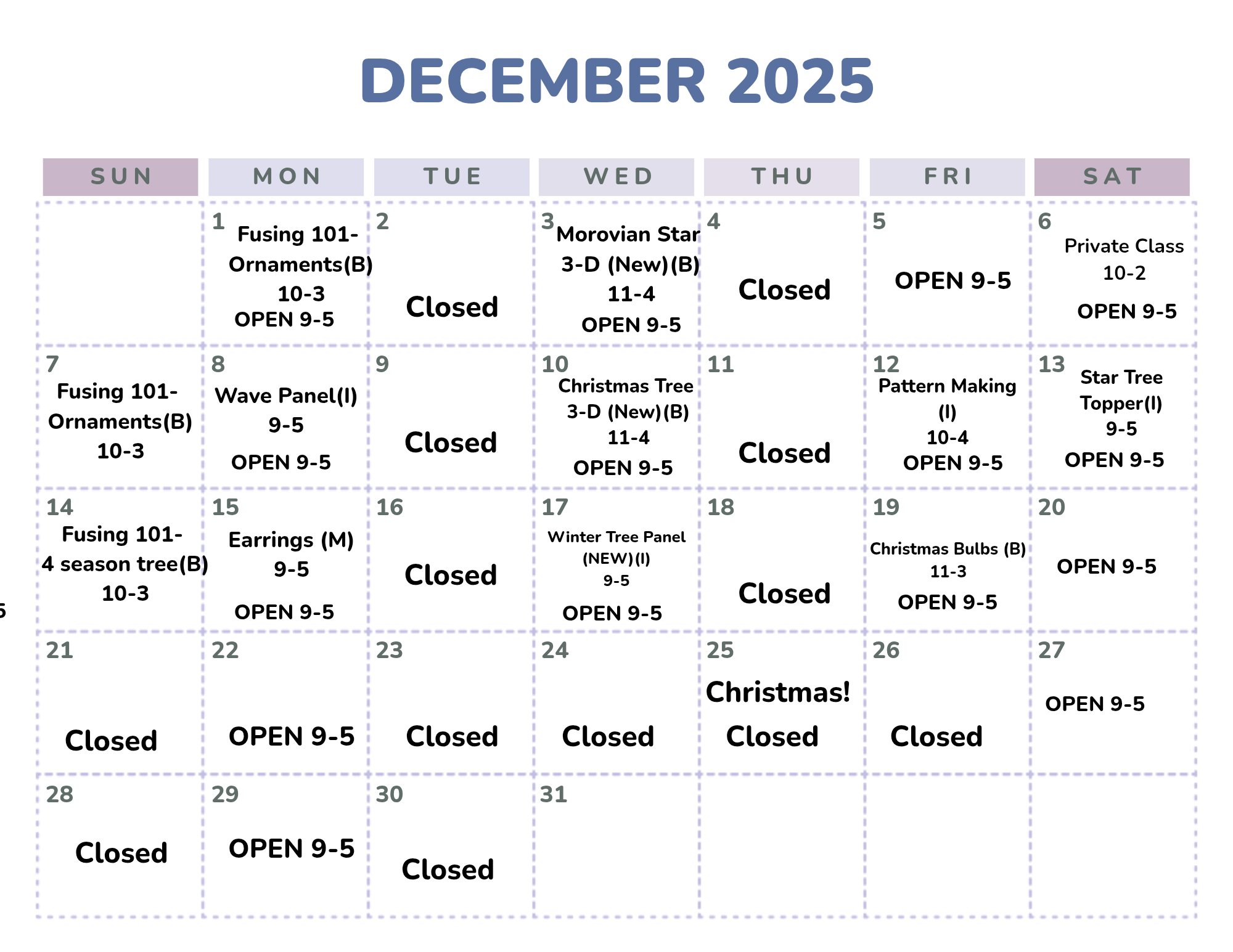 Glass: there are two ways to pay- retail glass or class scrap glass donation(this will be explained in detail when you come in) - I have room for about 15 Work on Your Own every day. It is a first come first serve space!