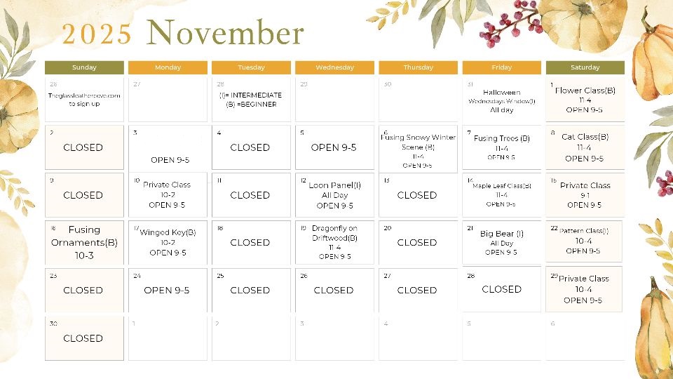 I offer public & private classes classes by appointment. Whether you’re a beginner or looking to refine your skills in the art of handcrafted stained glass, I provide personalized instruction tailored to your needs. For open to the public classes sign up on this page below the calendar. For PRIVATE GROUP CLASSES (Minumin 6 people) please contact me at info@theglassfeathercove.com to check availability. Please plan ahead at least 3 or more months ahead for private group class.